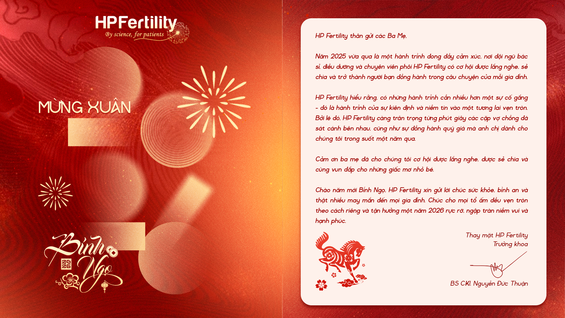 Những lời nhắn gửi từ ba mẹ gửi đến Bác sĩ Thuận và đội ngũ chuyên viên y tế không chỉ là minh chứng cho những trải nghiệm tuyệt vời mà ba mẹ nhận được khi đến với HP Fertility mà còn là sự khẳng định đúng đắn khi lựa chọn đặt trọn niềm tin vào hành trình đầy thử thách này. Mỗi thành công của ba mẹ và gia đình đều mang lại niềm vui lớn lao, động lực để HP Fertility hoàn thành sứ mệnh giúp đỡ các gia đình mong con. Bởi cuối cùng thì sau những khó khăn vất vả đã qua, niềm hạnh phúc khi chào đón con yêu là điều tuyệt vời nhất. Những tình cảm yêu thương chân thành từ ba mẹ sẽ luôn tiếp thêm động lực cho HP Fertility thêm vững vàng, đồng hành cùng ba mẹ để tạo ra thêm nhiều điều kỳ diệu trong tương lai.
